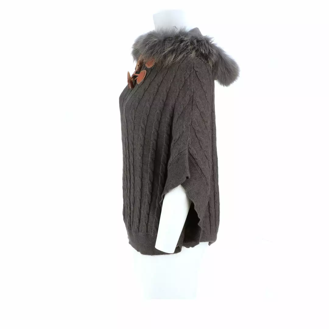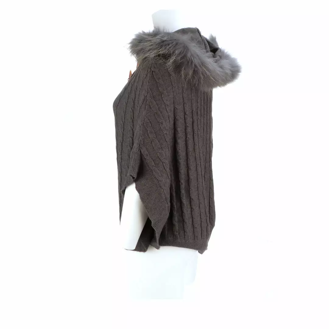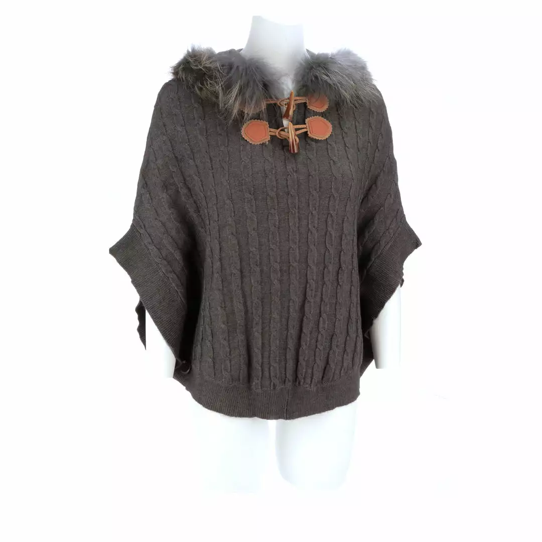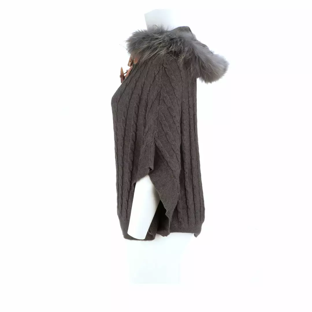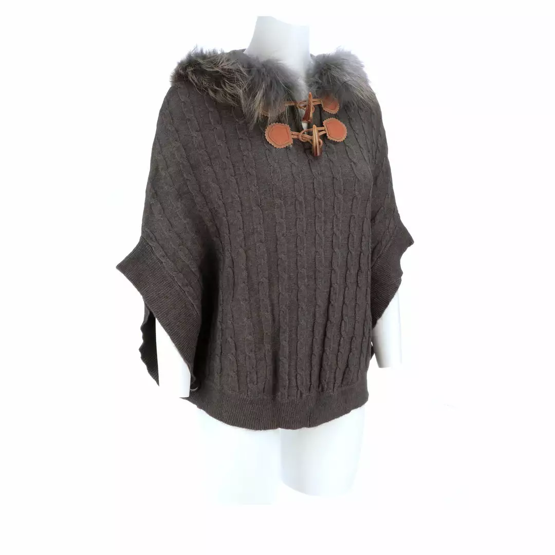 Get ready for cooler temperatures with our elegant Cable Knit Poncho. Complete with a fox-lined hood, this poncho is the height of elegance and comfort. Made from the softest cashmere blend with cable knitted style, you won’t want to take this off. Cashmere blend: 90% Cashmere, 10% angora Fox fur-lined hood Genuine leather-trimmed horn clasps