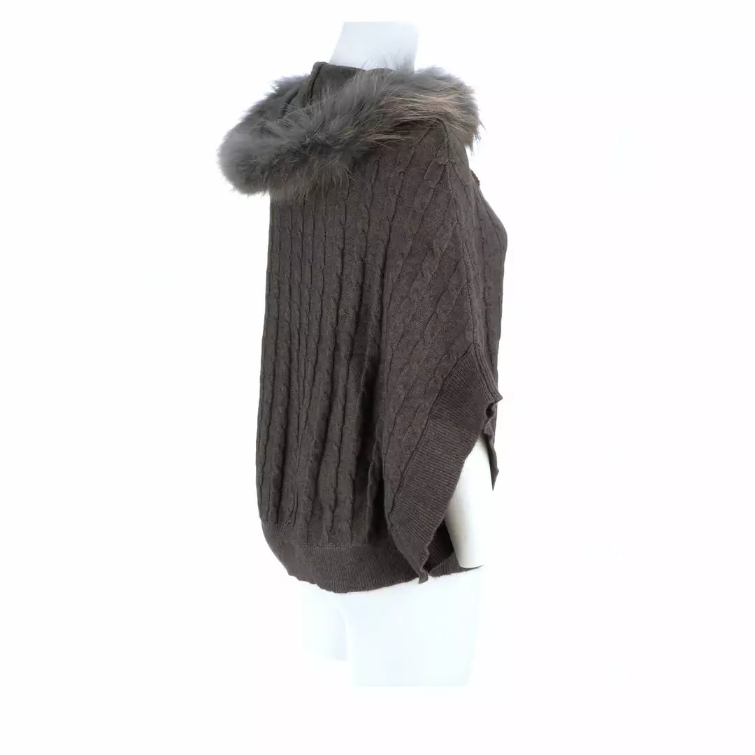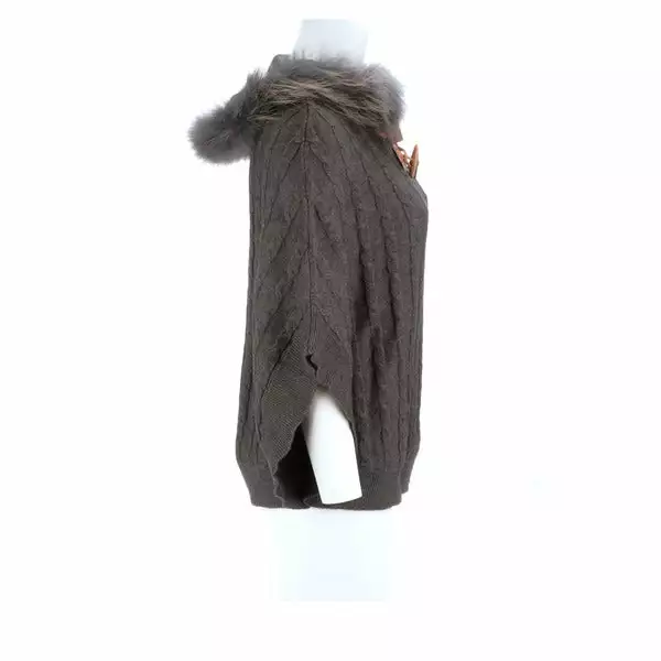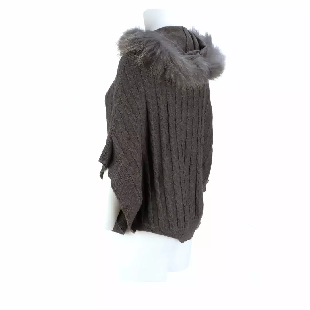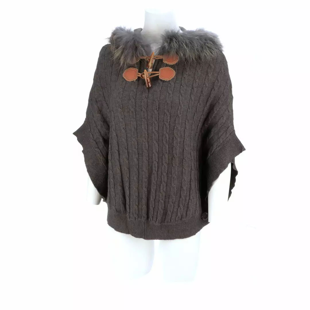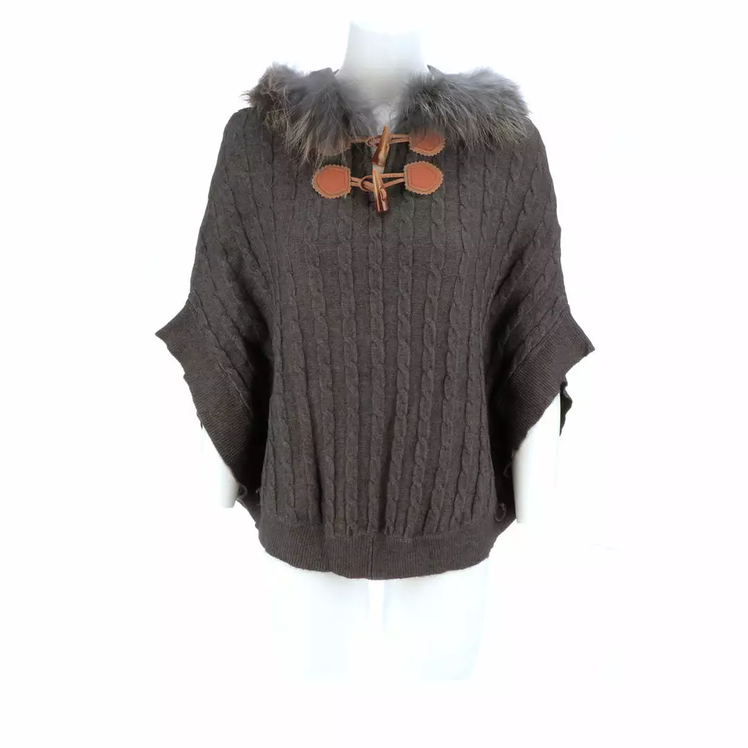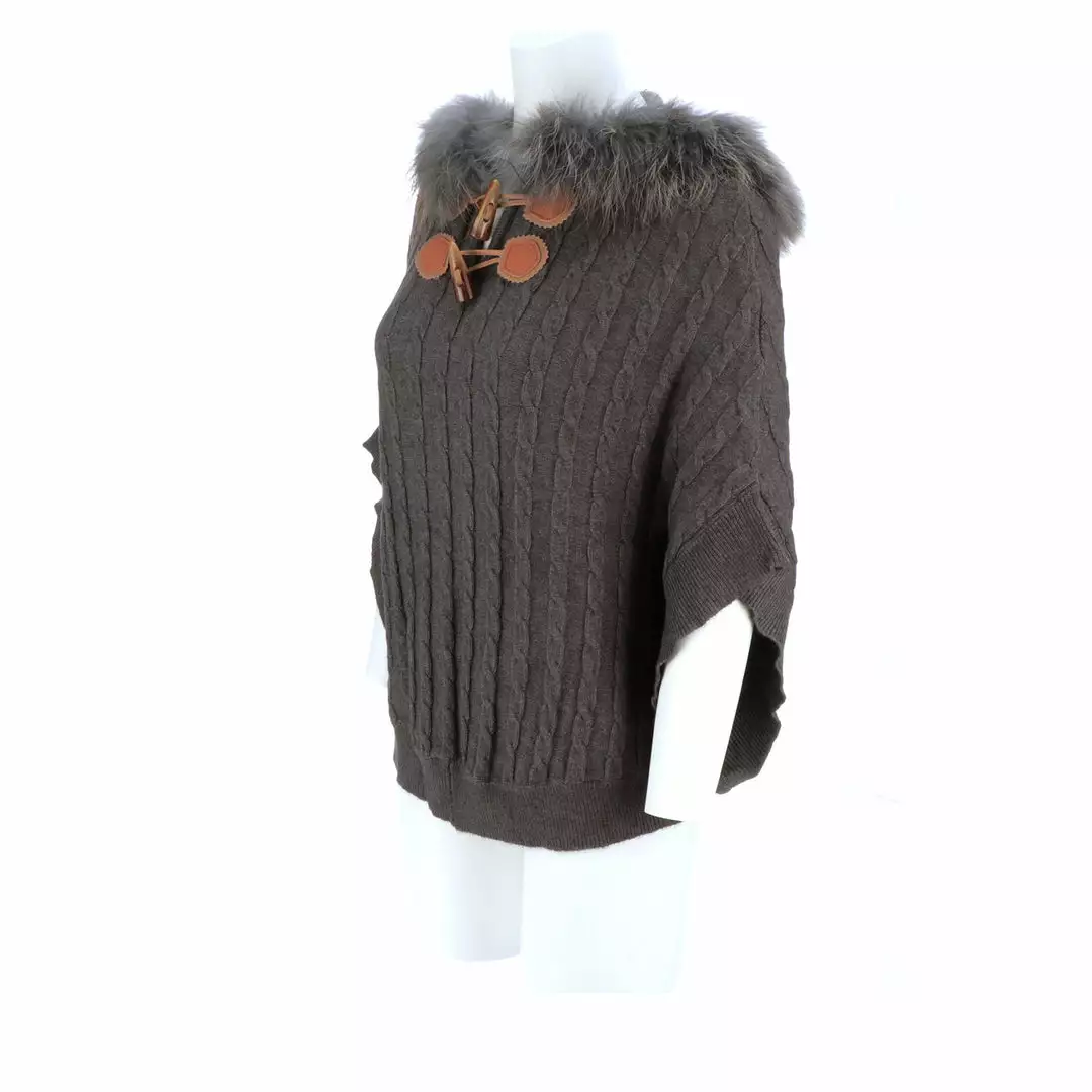Get ready for cooler temperatures with our elegant Cable Knit Poncho. Complete with a fox-lined hood, this poncho is the height of elegance and comfort. Made from the softest cashmere blend with cable knitted style, you won’t want to take this off. Cashmere blend: 90% Cashmere, 10% angora Fox fur-lined hood Genuine leather-trimmed horn clasps