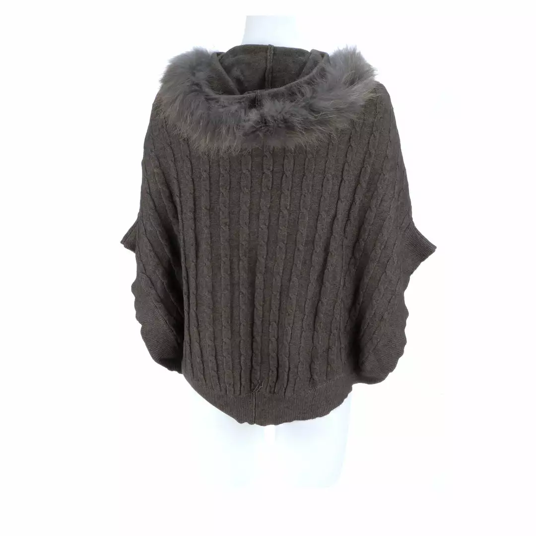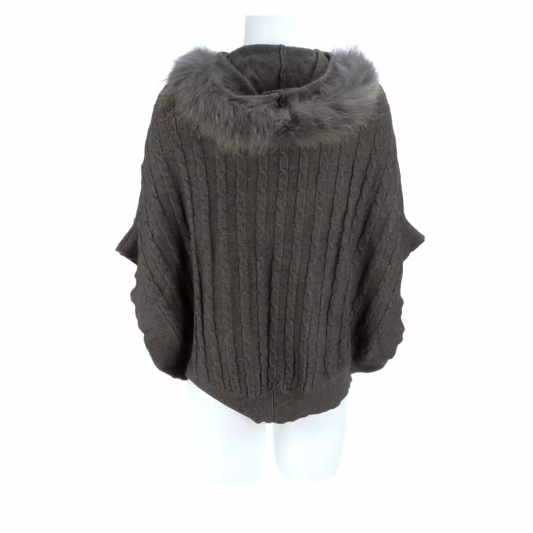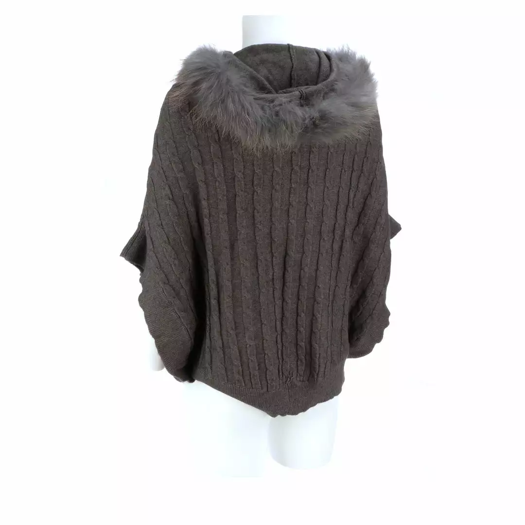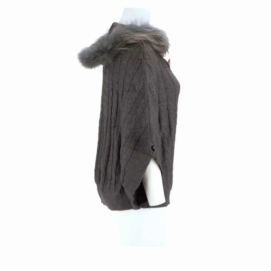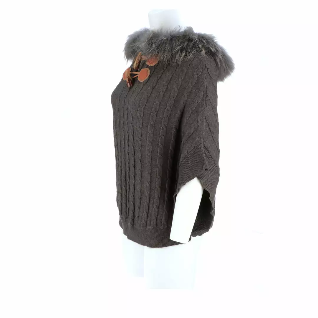 Get ready for cooler temperatures with our elegant Cable Knit Poncho. Complete with a fox-lined hood, this poncho is the height of elegance and comfort. Made from the softest cashmere blend with cable knitted style, you won’t want to take this off. Cashmere blend: 90% Cashmere, 10% angora Fox fur-lined hood Genuine leather-trimmed horn clasps