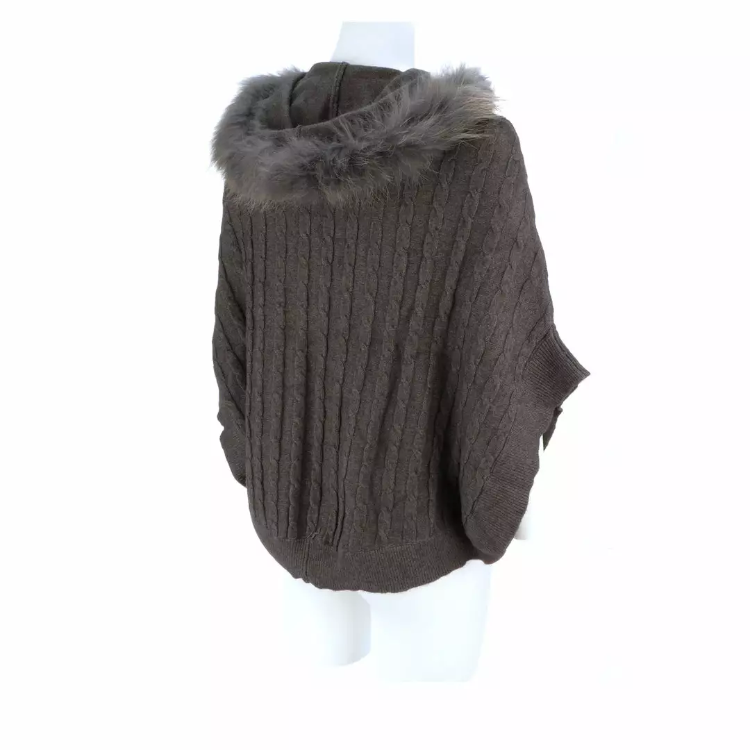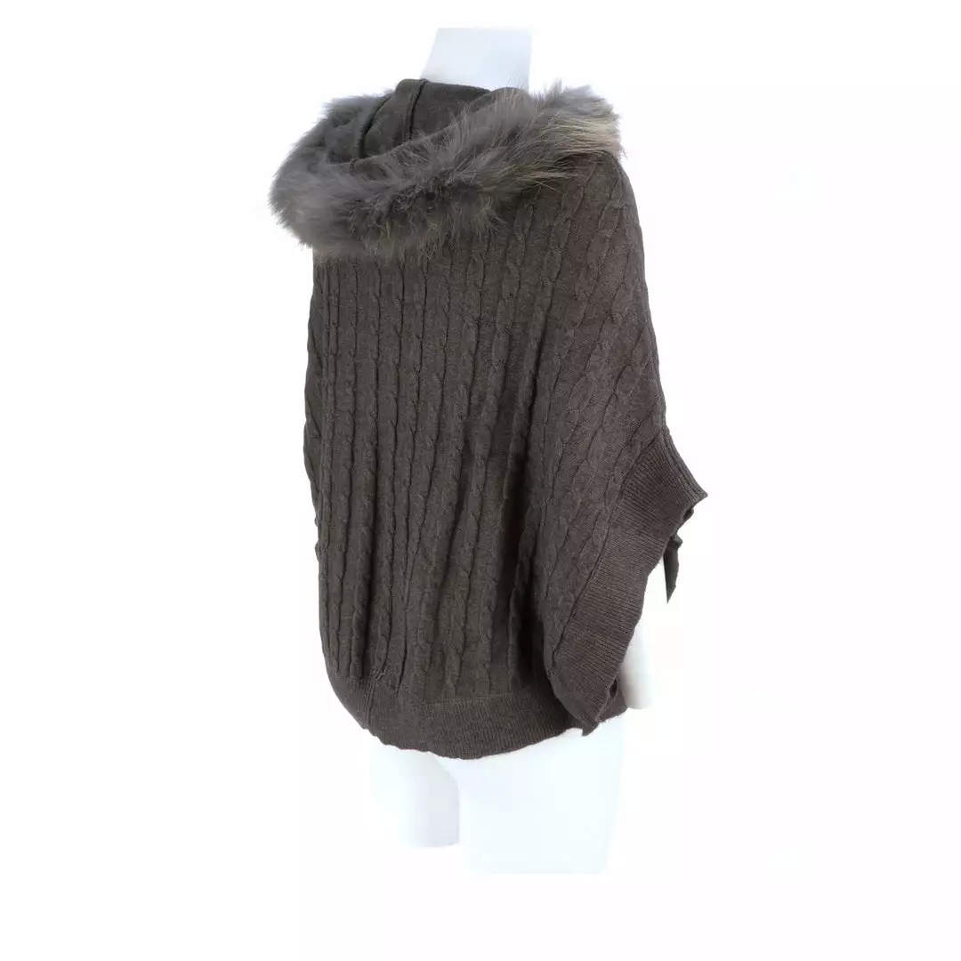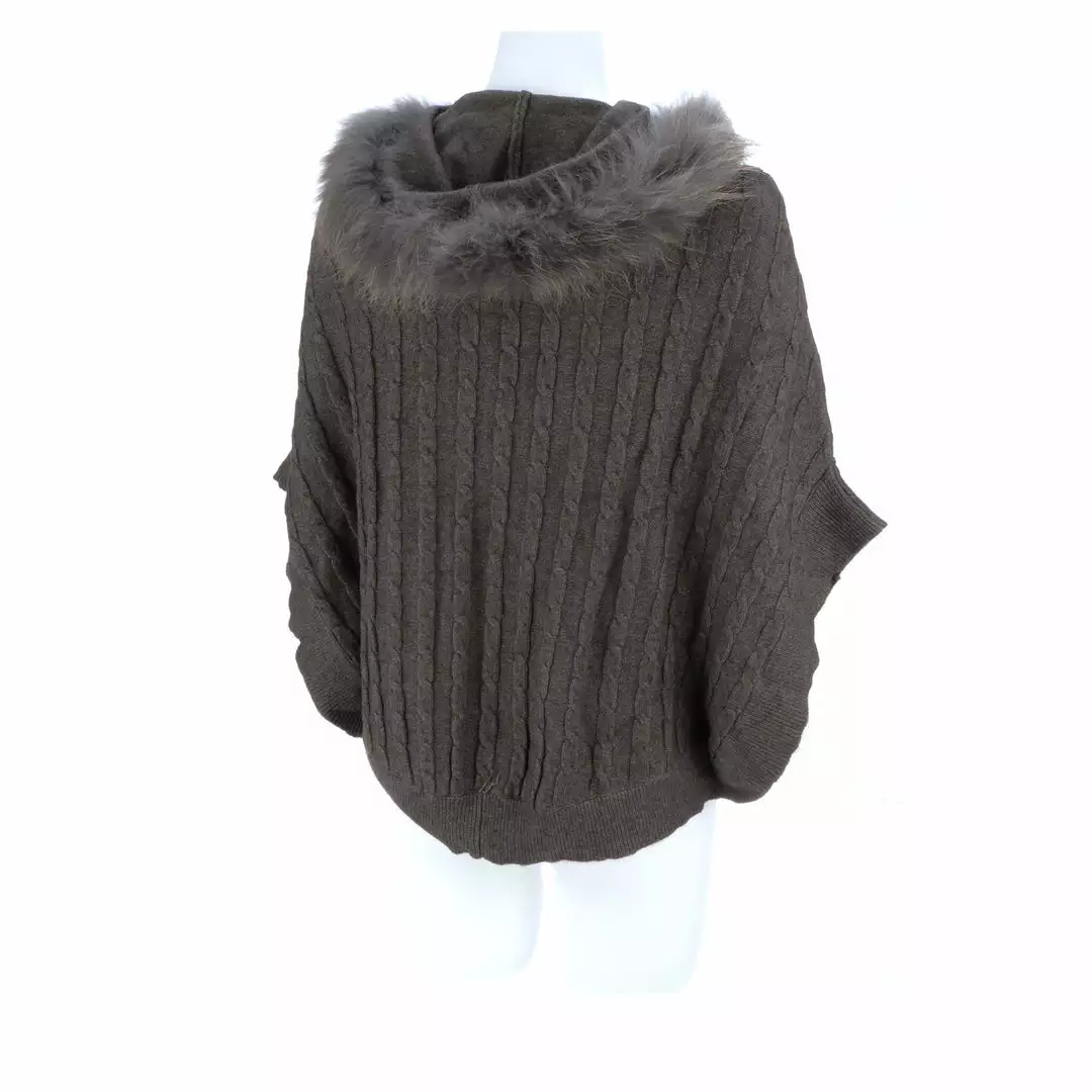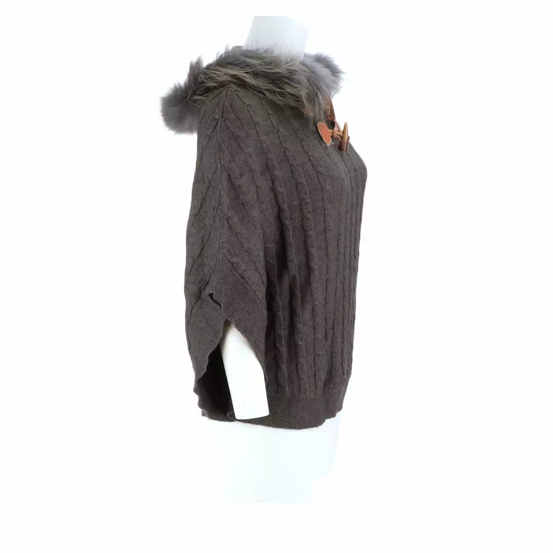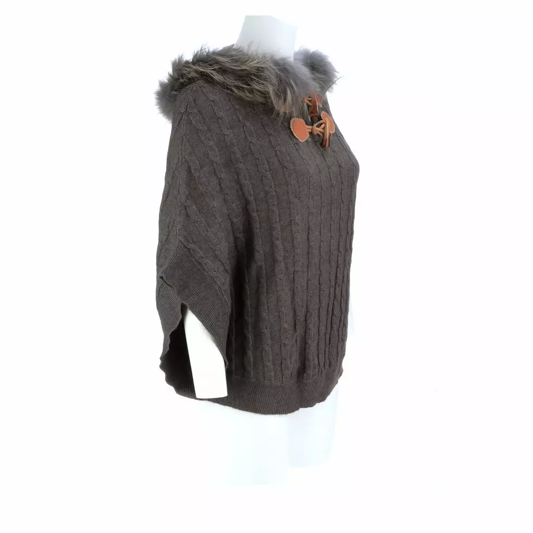 Get ready for cooler temperatures with our elegant Cable Knit Poncho. Complete with a fox-lined hood, this poncho is the height of elegance and comfort. Made from the softest cashmere blend with cable knitted style, you won’t want to take this off. Cashmere blend: 90% Cashmere, 10% angora Fox fur-lined hood Genuine leather-trimmed horn clasps