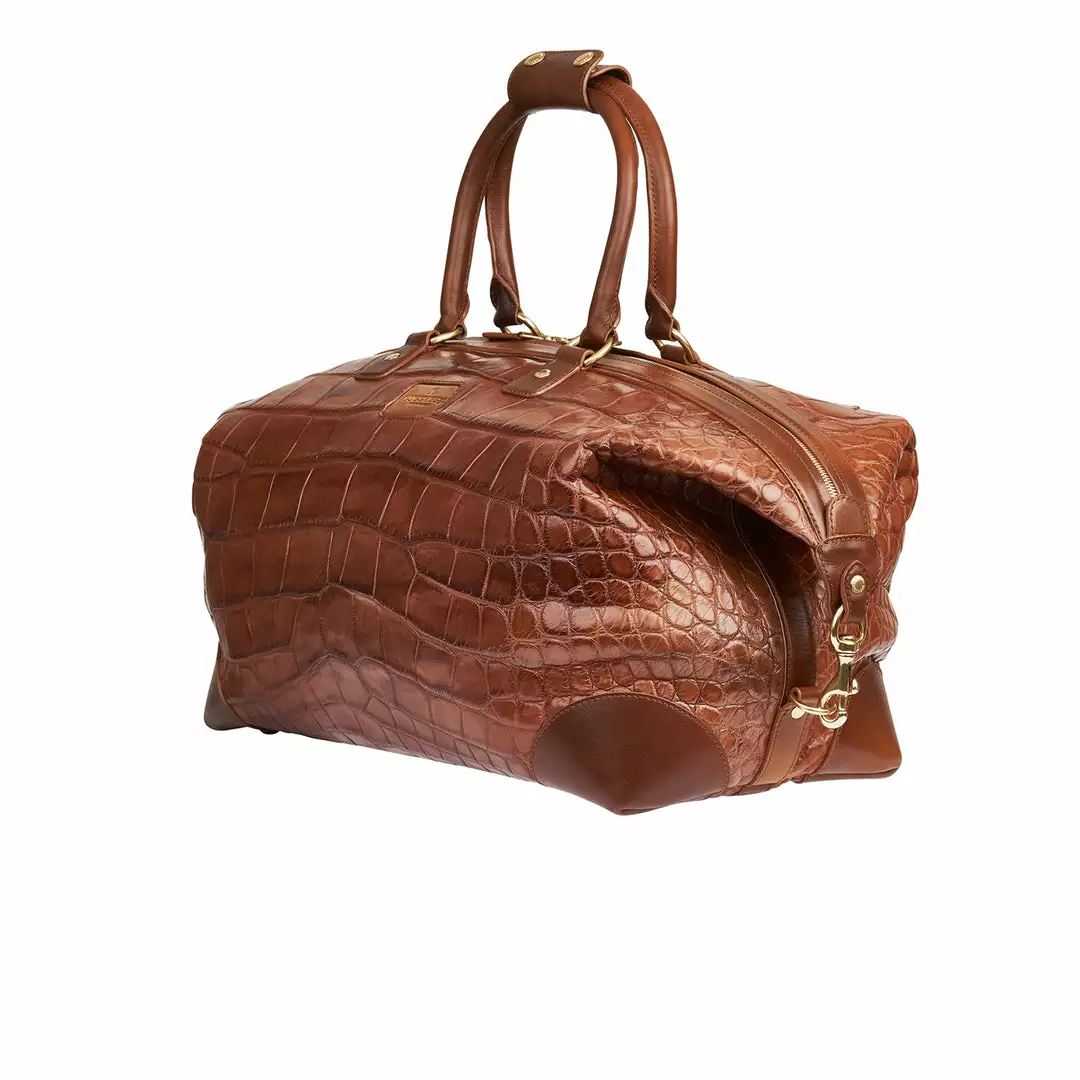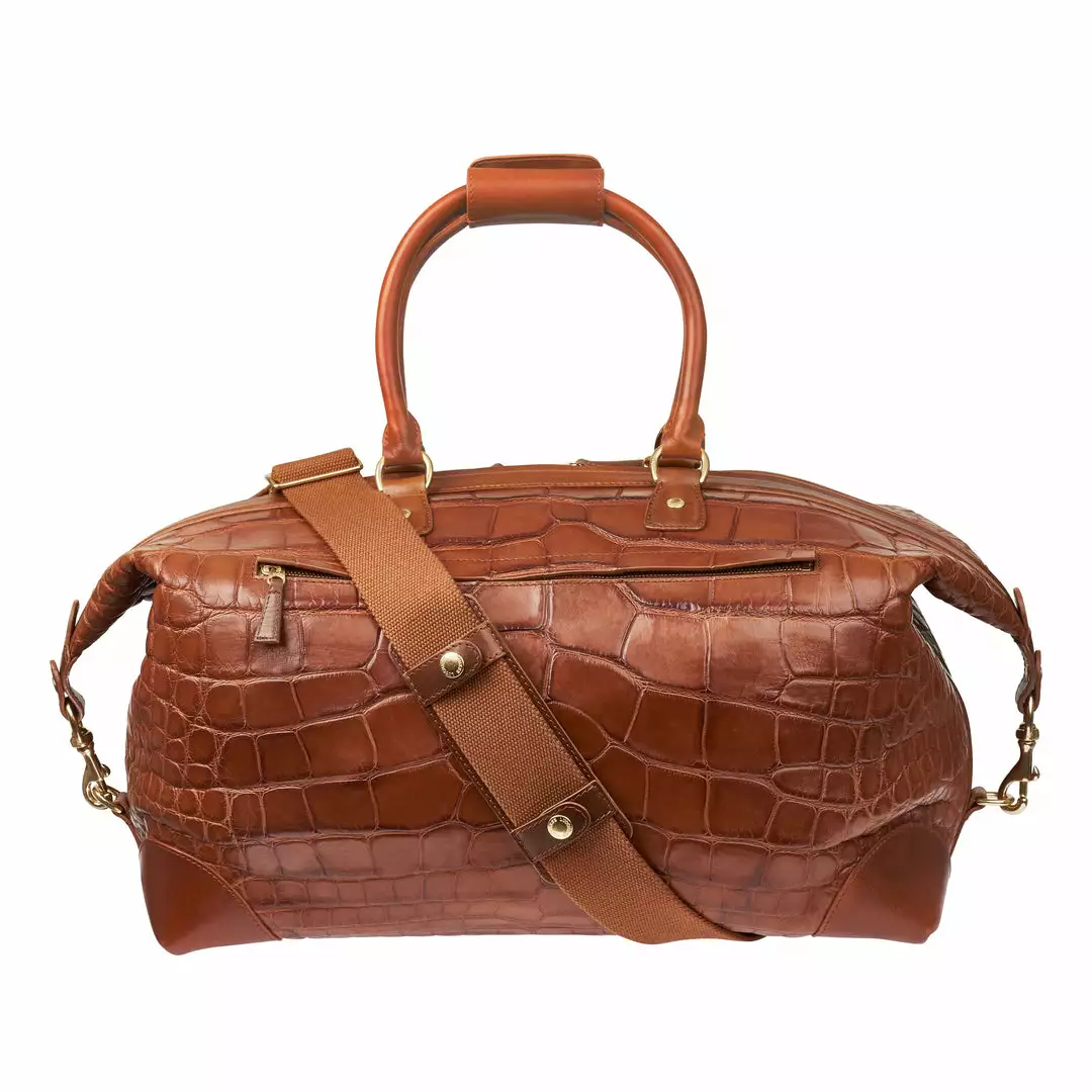 Built with Luccheseβs own giant American alligator, this signature duffel totes your essentials in first class style. The fold-end construction allows for maximum packing space, which includes natural, water-resistant canvas lining, an interior zipper pocket and two open storage slots. Additional features: Lucchese-branded brass hardware, brass feet, exterior pocket, double zipper entry and a detachable, adjustable shoulder strap. Due to the authentic nature of Giant Gator skin, size and shape of tiles may vary–each bag is unique. Available in cognac (small only) and chocolate (small and large). Handmade in the U.S.A. Small: 19″ L x 9″ W x 12″ H Large: 22″ L x 11″ W x 13″ H