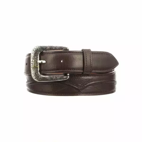 Lucchese menโs belt made with buffalo leather. The buffalo leather has a rich color and seville stitching, promising durability and style. Finally, the belt’s silver plated buckle features intricate details with a Southwest touch. Handmade in Texas. 1.5″ wide Seville stitching Removable buckle