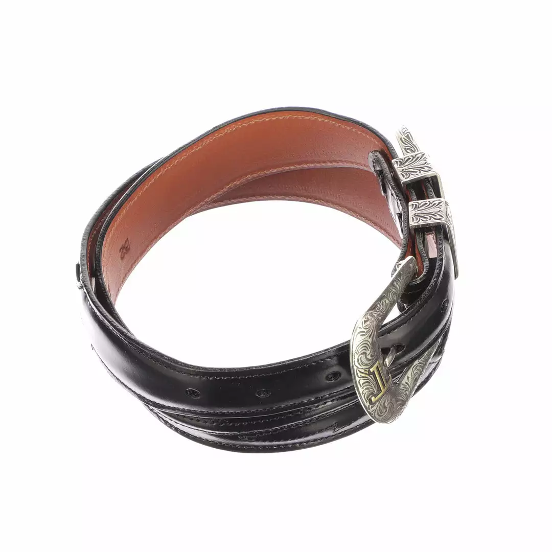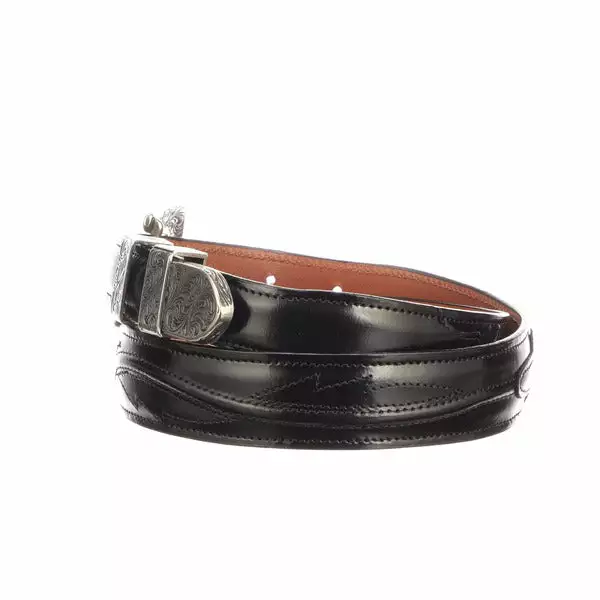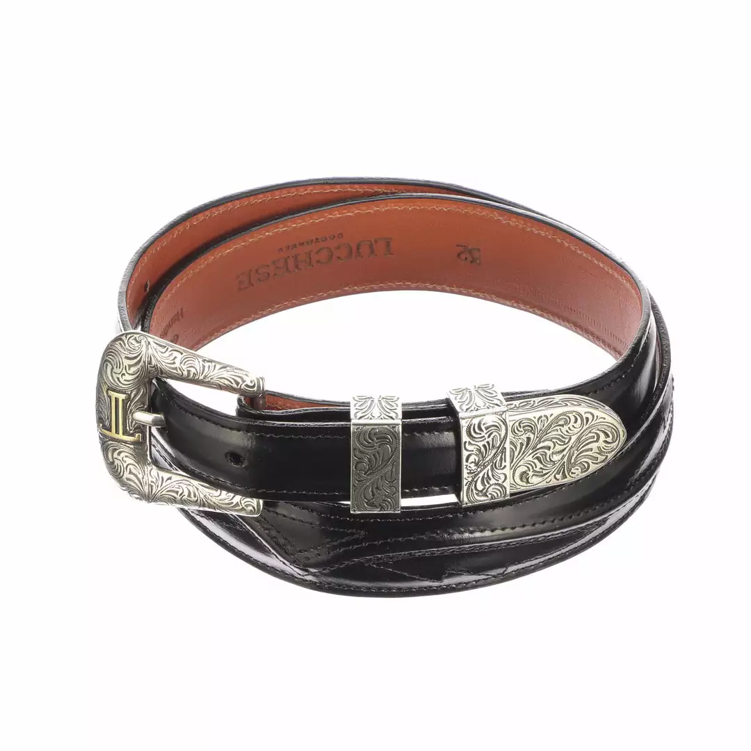 Lucchese men’s belt made with goat leather. With its silver plated buckle and seville stitching, the belt can be paired with a suit or jeans. Handmade in Texas.