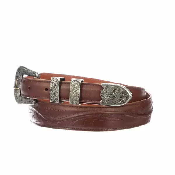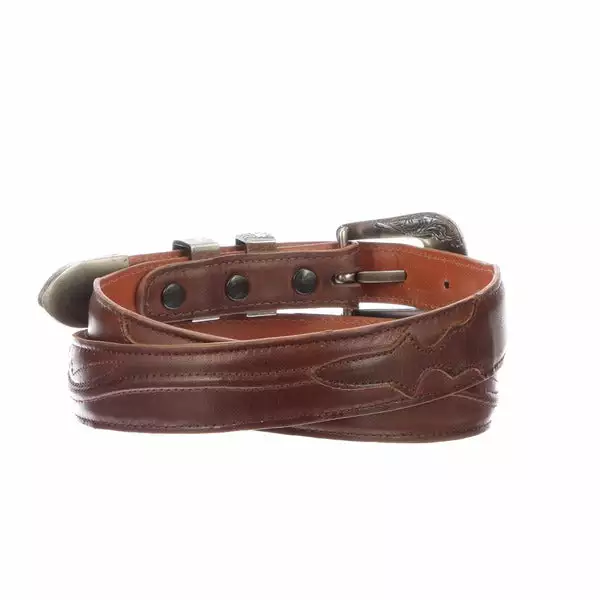 Lucchese men’s belt made with ranch hand cowhide leather. Lucchese craftsmen use a unique polish method that create different hues and add texture to the leather, giving it a vintage look. The belt features seville stitching and a silver plated buckle with Western details, adding style and character. Handmade in Texas. 1.25″ tapered down to 1″ Seville stitching Silver plated tip Removable buckle