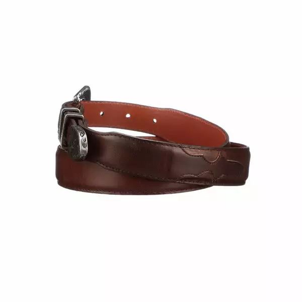 Lucchese men’s belt made with ranch hand cowhide leather. Lucchese craftsmen use a unique polish method that create different hues and add texture to the leather, giving it a vintage look. The belt features a silver plated buckle with Western details, adding style and character. Handmade in Texas. 1.25″ tapered down to 1″ Silver plated tip Removable buckle