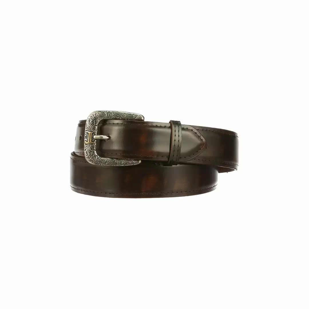 Lucchese men’s belt made with burnished goat leather. Lucchese craftsmen use a unique polish method that create different hues and add texture to the leather, giving it a vintage look. The belt’s design features subtle Western elements with its seville stitching and silver plated buckle– perfect for jeans or a suit. Handmade in Texas. 1.5″ wide Seville stitching Removable buckle
